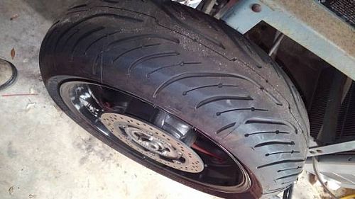 tire Michelin road pilot 4 with good tread, sprocket and rotor in great shape,,, rim does have a bend on one side but does not wobble and has scratches.