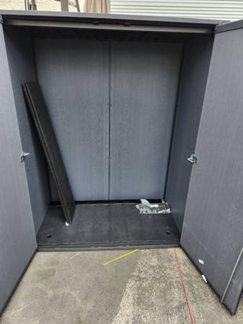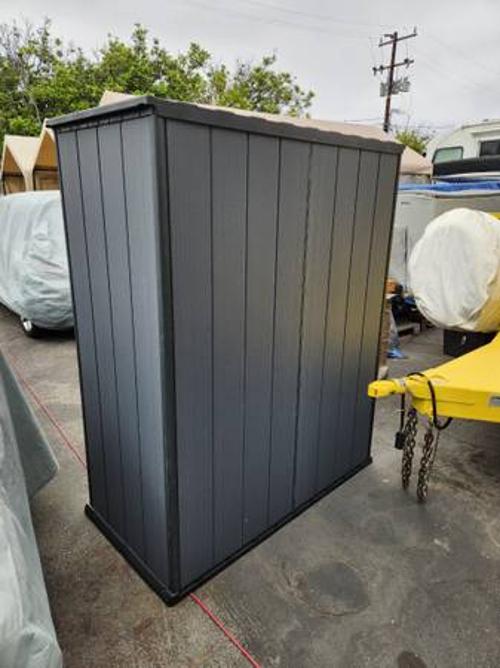 - BRAND NEW KETER CORTINA ALTO PREMIUM MODERN VERTICAL OUTDOOR STORAGE SHED. NEW AND ALREADY ASSEMBLED. 4.5' X 2.5' X 6' TALL. COMES WITH 2 SHELVES.