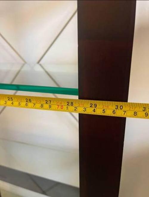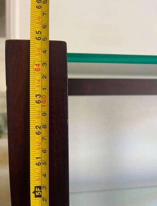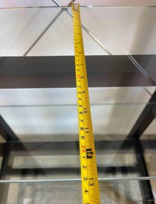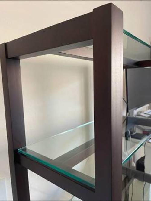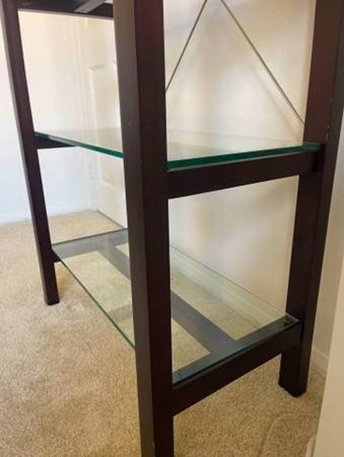 - Crate and Barrel Bookcase book display case with 5 tempered glass shelves. Heavy duty. Measurements in photos.