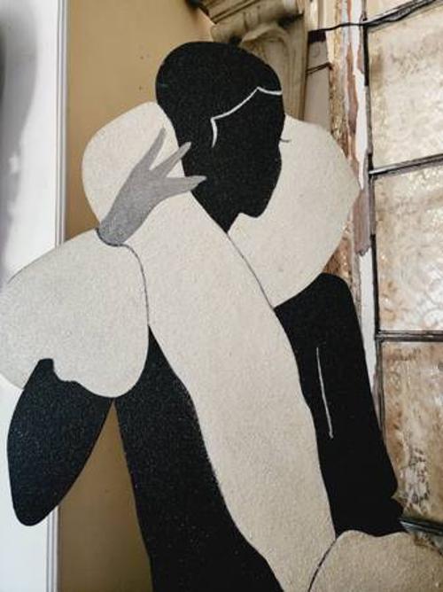- RARE - Beautiful life-size wooden flapper. Sparkly cream and black attire. She is wearing a flapper hat and dress typical of the 1920s. Perfect for boudoirs, rooms, or storefronts, period flapper parties, or as a boutique display. You can add a name to it for a vintage store. It has a stand that can be placed anywhere.