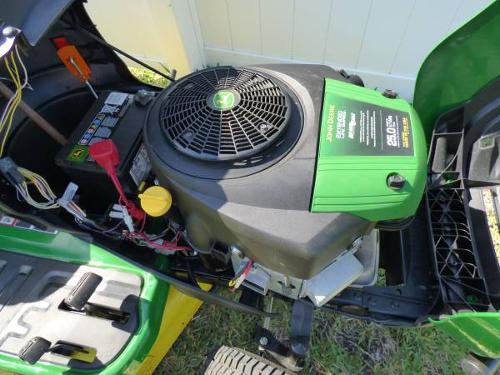- John Deere with a 25-HP, V-Twin, choke-free Ready Start Branded ELS (Extended Life Series) not the 24HP on the new model or the E160. Great BIG and comfortable seat with adjustable lumbar control, yes, lumbar support. Cruise Control. 2 years old with 38 Hours. The new one goes for $3100, plus taxes, and they don't even have it in stock.