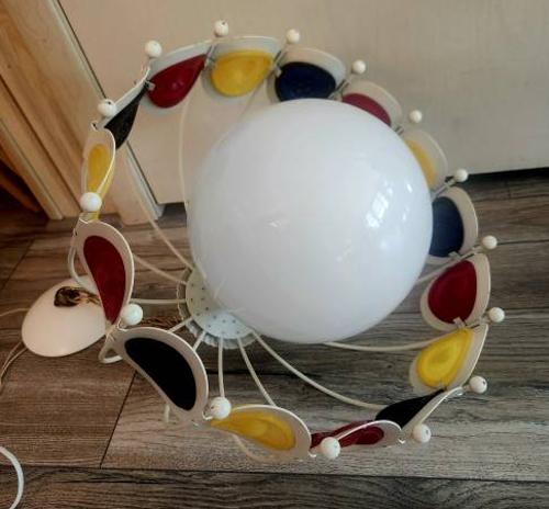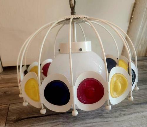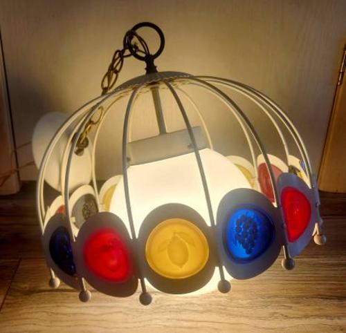 - Groovy early 1970s mod hanging light, all original, white metal cage over white glass globe encircled by primary color medallions of raised fruit, apples, pears, and grapes, hanging chain and ceiling cap, can be hard wired or swagged, made in the US by Progress Lighting