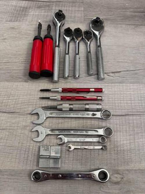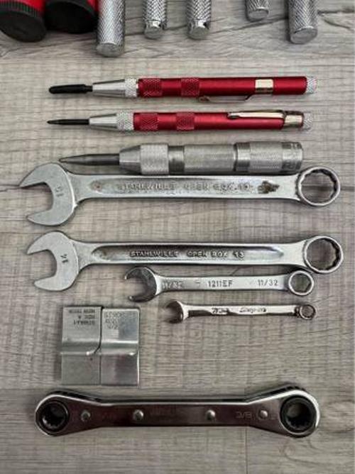 There are ratchets, deburr tools, center punches, and a few wrenches. Brands are Snap On, Blue Point, Proto, Vargus, Stahlwille, and Starrett.