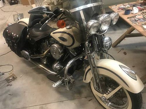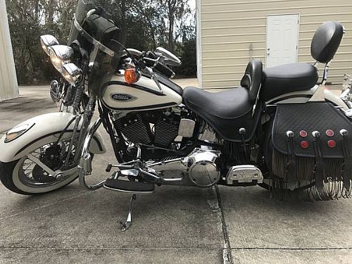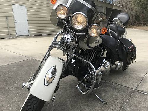 - 1997 heritage softail springer new tires 17292miles been completely serviced by Harley mechanic new cam andrews white with blue stripe Vance and Hines pipes collector motorcycle.